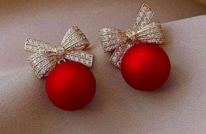 Each earring features a beautifully crafted bow, meticulously paved with brilliant cubic zirconia stones that radiate dazzling sparkle with every turn of the head. The luxurious gold-toned setting enhances the radiance of the stones, creating an eye-catching top stud. Suspended gracefully from the shimmering bow is a vibrant, matte crimson red spherical bead. This bold red sphere adds a modern, chic contrast to the classic sparkle, making these earrings truly unique.