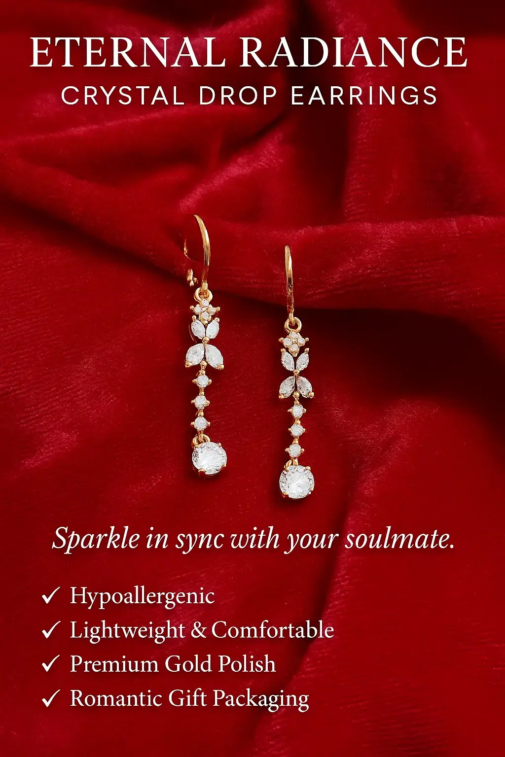 Sparkle in sync with your soulmate. Eternal Radiance Crystal Drop Earring, These gold-finished crystal drop earrings reflect timeless love, perfect for romantic evenings and heartfelt gifts.